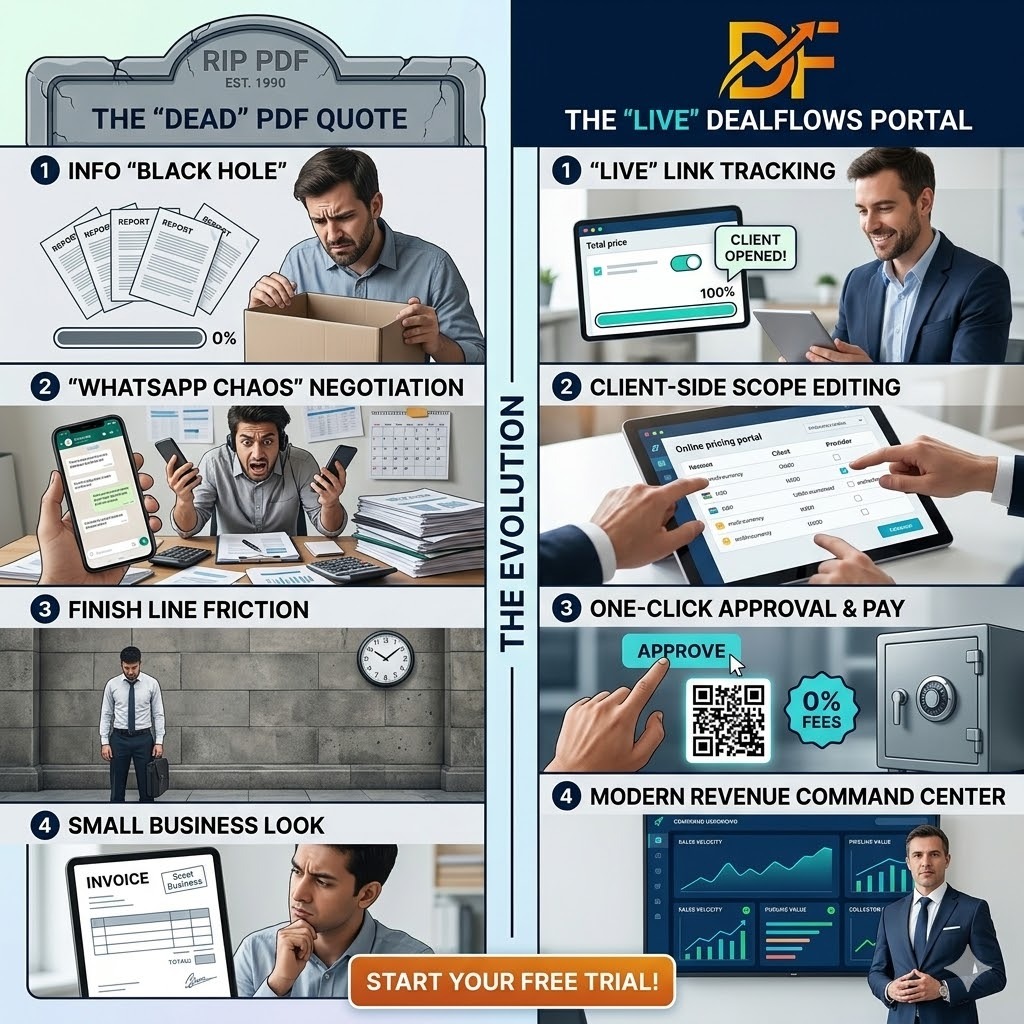The truth? Static PDFs are 'dead' files. They are killing your conversion rates, slowing down your cash flow, and making you look like a legacy business.